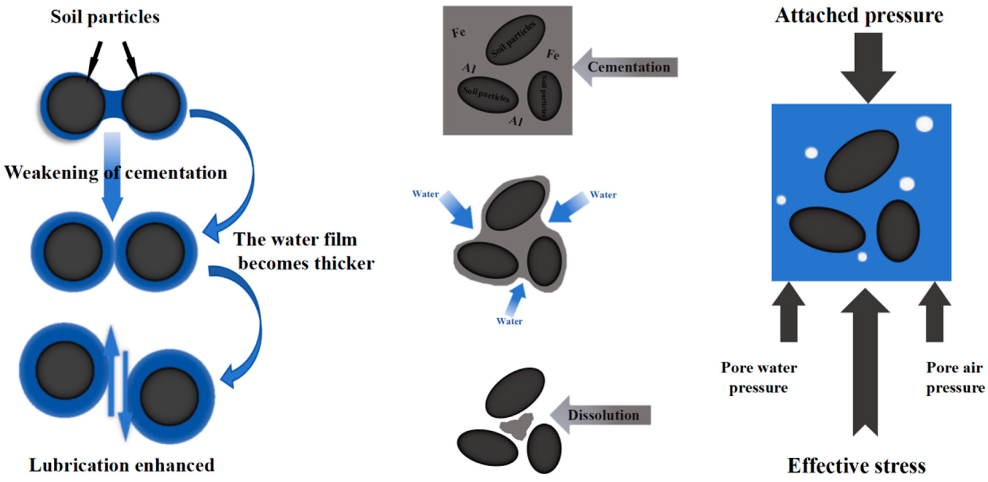 The influence mechanism of water content on the settlement of red clay is shown in Figure 10. From the analysis of the physical mechanism, the water molecules in red clay filler exist in the form of bound water and free water. With the increase in water content, the weak bound water film becomes thicker, the viscosity and molecular gravity between soil particles become weaker, and the free water content increases. The lubrication effect will further reduce the friction resistance and bond strength between the particles [46], making it easier for soil particles to produce dislocation deformation and increase soil settlement. From the analysis of chemical mechanism, red clay is rich in iron and aluminum oxides [47]. These cementing materials may dissolve under high water content conditions, further weakening the structural strength of the soil. From the perspective of mechanics, the dissipation of pore water pressure increases the effective stress [48], and the soil deforms. Under the condition of high water content, the settlement of the embankment develops faster and takes longer to reach stability.