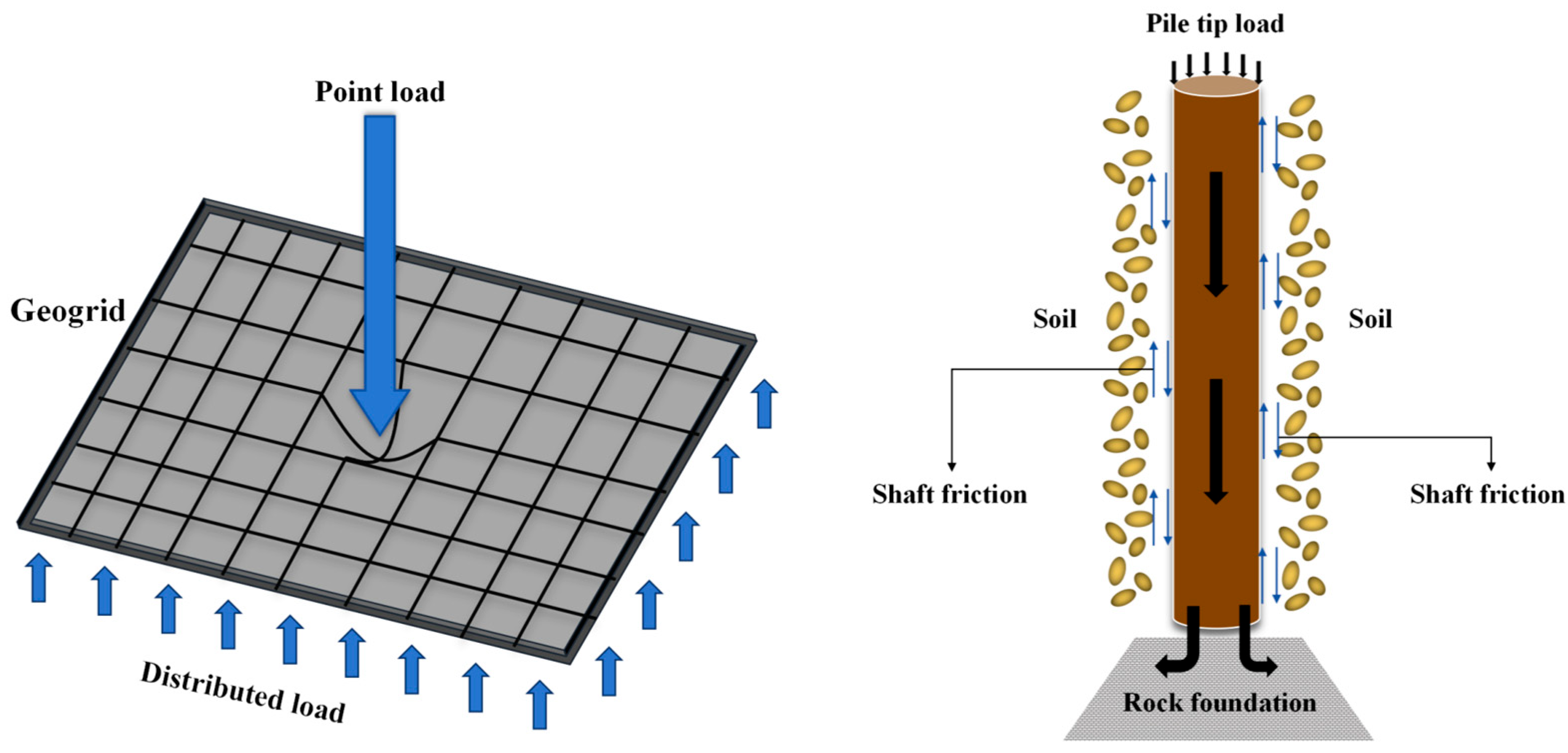 Geogrid + anti-slide piles. Horizontally placed geogrids redistribute vertical loads and alleviate local stress concentrations while constraining lateral deformation, thereby enhancing shear resistance and reducing settlement attributable to shear strains. As shown in Figure 12, anti-slide piles, acting as stiff inclusions socketed into competent strata, directly share vertical loads and transfer stresses to deeper layers through side friction (and end bearing where applicable), which decreases the compressive deformation within the shallow fill. The combined ‘vertical + horizontal’ reinforcement creates a composite system that effectively curtails the overall settlement.