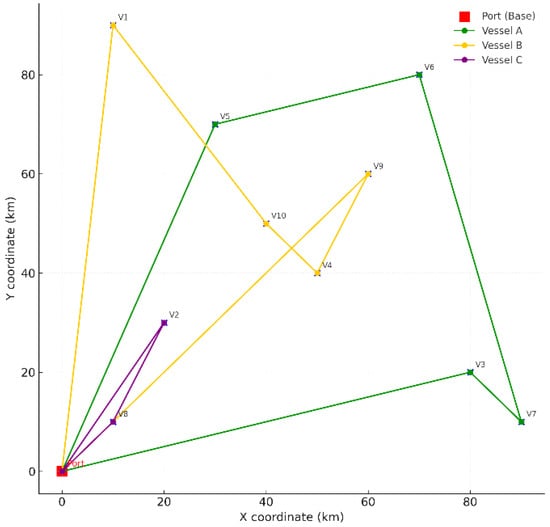 Table 4 summarizes the outcomes of the sensitivity analysis under different fleet configurations. The results confirm that three vessels provide the lowest total cost (7144 EUR) while still meeting operational time limits. Adding a fourth or fifth vessel does not reduce variable costs, since the sailing distance remains constant, but increases fixed costs, leading to 7–14% higher expenses. This demonstrates that excessive fleet size reduces economic efficiency without operational benefit. The table also highlights the robustness of the model: under varying scenarios, the optimal solution consistently favors the use of three bunkering vessels. Such findings provide quantitative evidence for managerial decisions in fleet planning and resource allocation.