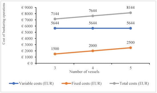 For the “demand doubled” scenario (where the total demand is 4800 tons), the cost components were recalculated, taking into account the need for more vessels and increased fuel consumption. A detailed breakdown of the cost for this scenario is provided in Table 5 below:
