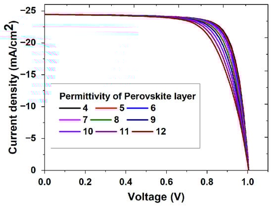 J-V curves for a stack FTO/ITO/NiOx/CH3NH3PbI3/ZnO/Ag/Al with different relative permittivity of CH3NH3PbI3 under illumination (1000 W/m2).