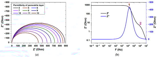 Figure 4 shows the simulation electrical impedance for various relative permittivity values ranging from 4 to 12. In the Nyquist diagram (Figure 4a), it is clear that the impedance spectra consist of a sizable semicircle, which is highly influenced by the permittivity of the active layer of CH3NH3PbI3. This shape of impedance spectra in the Nyquist diagram belongs to the responses usually encountered in solar systems, in which carrier transport is determined by diffusion–recombination. With an increase in the dielectric permittivity of the active layer, the semicircle’s diameter shrank.