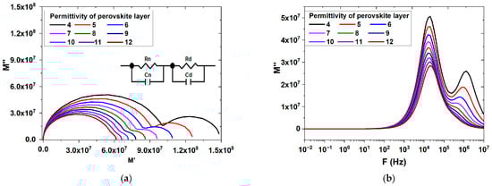 Figure 5 exhibits modulus spectra at various relative permittivity of perovskite layer, where Figure 5a shows M”–M’ to the variation in the real part and imaginary part in relative permittivity ranges of 4–12. The real axis intersection displays at the intercept the capacitance caused by recombination or ionic transport. Semicircular arcs at low and high frequencies (two relaxation processes) were detected for each sample. The small semicircular arcs at high frequencies are due to the effect of the recombination process. At low frequencies, the huge semicircular arcs correspond to the electrode processes’ effects on the ionic transport. Figure 5b depicts the imaginary part of electrical modulus, M” against the frequency in the relative permittivity order perovskite layer range from 4 to 12. It is clearly seen that similar behavior was observed. It is clearly observed from (Figure 5b) that M” versus frequency curves have two peaks at each value of relative permittivity; one of the peaks is in a low-frequency region and the other in a high-frequency region. It can be noticed that those peaks observed at low frequency move to the higher-frequency regions, and the peaks observed at higher frequencies move to the low-frequency region with increasing relative permittivity. We also noticed that at higher values of relative permittivity, both peaks overlapped.