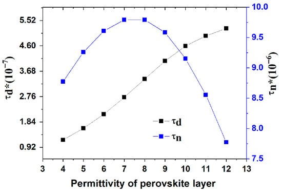 In a PSC, the characterization and identification of the recombination and ionic transport mechanisms in thin-film solar cells have been an important challenge for the community [34,35,36]. The equivalent circuit model described contains two characteristic times related to the recombination τ1 (recombination time) and the ionic transport τ2 [33,37]. Figure 7 shows the dependence of both relation times deduced from the equivalent circuit on an increasing relative permittivity. We have observed that the recombination time, τ1, decreases with an increase in εr, indicating that the recombination rate increases. This enhanced recombination directly leads to the degradation of the solar cell’s performance, as observed in the reduction in FF and η. For the ionic transport time τ2, their evolution shows a peak at 7 of the relative permittivity value. Above this value, the ionic transport process is more dominant compared with the recombination process; this phenomenon generates a cell with low efficiency, as shown in Figure 3b.