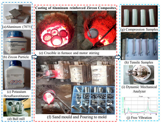 Processing of composites: (a) Aluminum 7075, (b) Zirconium silicate, (c) Potassium Hexaflurotitanate, (d) ball milling used to mix zirconium silicate with potassium hexafluorotitanate (e) Crucible and mechanical stirring, (f) Sand casting, (g) Compression samples, (h) Tensile samples, (i) Dynamic Mechanical Analyzer, (j) Free vibration analyses.