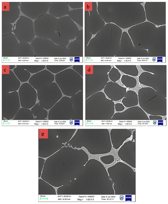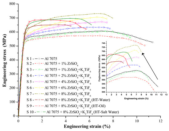 For instance, the tensile strength of the S7 composite, which contains 8% ZrSiO4, reaches 735.35 MPa with an elongation of 7.84%. However, after heat treatment, the tensile strength decreases to 660 MPa, and the elongation decreases to 4.54%. When subjected to heat treatment in a water solution, the tensile strength further decreases to 688 MPa, with elongation reducing to 5.61%. ZrSiO4 particles act as hard phases within the composites, pinning grain boundaries and serving as obstacles to crack propagation, which leads to increased strength and toughness. Furthermore, the addition of ZrSiO4 and K2TiF6 contributes to the refinement of the grain structure in the aluminum matrix. This refinement enhances the material’s strength through a mechanism known as grain boundary strengthening or the Hall–Petch effect [31,32].