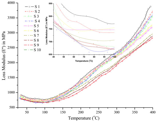 Figure 5 and Figure 6 show the storage modulus (E′) and loss modulus (E″) of Al 7075 and its composites, respectively. The storage modulus of Al 7075 is 66 MPa at 30 °C. As the temperature increases, the storage modulus decreases by 62.4 MPa up to 215 °C. After this point, the storage modulus starts to increase and reaches 64.6 MPa at 353 °C. This behavior is due to the fact that 220 °C is within a typical aging range for 7075 aluminum, and the alloy is subjected to prolonged exposure at this temperature [45,46].
