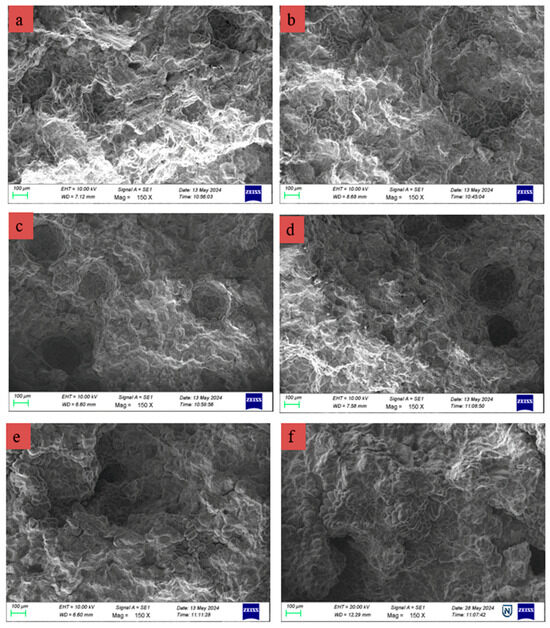 The addition of ZrSiO4 particles leads to a strengthening mechanism known as dispersion strengthening [27]. This occurs because the ZrSiO4 particles restrict the movement of dislocations in the aluminum matrix [28]. Dislocations are defects in the crystal structure that move when the material is deformed. The presence of hard ZrSiO4 particles makes it more difficult for dislocations to move, thus increasing the strength of the composite material. These particles create barriers that hinder dislocation motion, increasing the material’s resistance to plastic deformation under tensile stress. As a result, the tensile strength of the composites increases, while the strain value decreases with the addition of both reinforcement and the wettability agent.