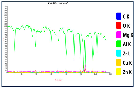 Line scan mapping of Al 7075 (8% ZrSiO4) saltwater-quenched composites.