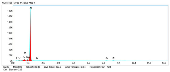 With the addition of the wettability agent and zirconium particles in Al 7075, new characteristic peaks were observed at strong positions: 423, 571, 749, 894, 1050, 1400, 1640, 1700, 1780, and 3127 cm−1. In spectroscopy, the presence of multiple peaks typically suggests the existence of various chemical bonds or functional groups in the sample. These peaks correspond to Si–C and Si–O–Si bonds, which are a result of the dehydration and condensation reactions of silane groups, as well as C–F oscillation modes [43,44,45].