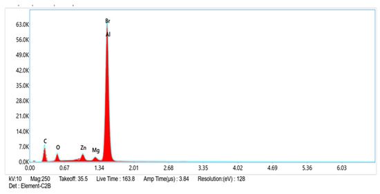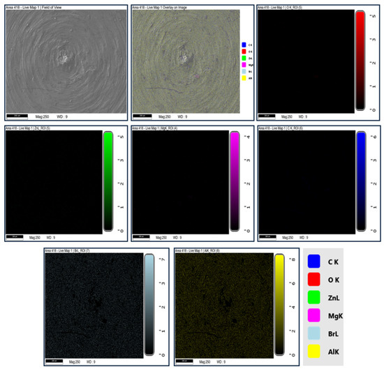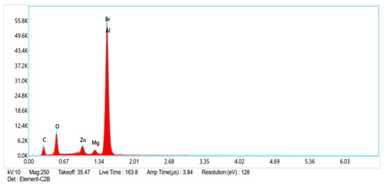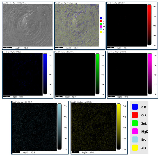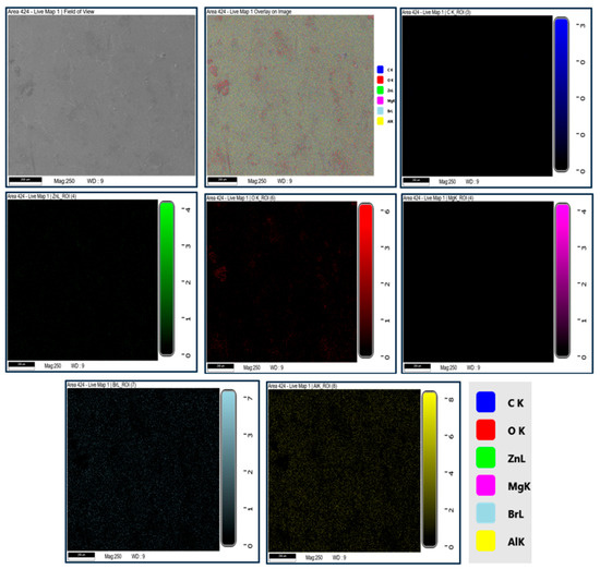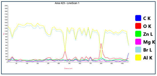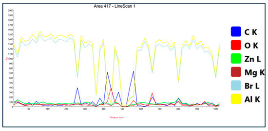 Figure 15, Figure 16 and Figure 17 present the EDX mapping, line scan element mapping, and EDX element mapping of oil-quenched composites, respectively. Table 10 provides the elements and atomic mapping of the oil-quenched composites. The K lines represent higher energy, while the L lines represent lower energy. Carbon (C K) accounts for 51.6% of the total mass of the sample, while Bromine (Br L) makes up 9.6%. Carbon (C K) also represents 72.3% of the atoms in the sample, while Bromine (Br L) accounts for only 2.0%. Carbon (C K) is the most abundant element by weight (51.6%), but it is even more abundant by atomic percentage (72.3%). This suggests that carbon atoms are lighter than other elements in the sample, which allows them to make up a larger proportion of the total number of atoms than their weight contribution would suggest. Oxygen (O K) has a relatively low weight percentage (5.5%) and atomic percentage (5.8%). The small difference between weight % and atomic % indicates that oxygen atoms are relatively light and contribute proportionally to both the mass and the number of atoms. Magnesium (Mg K), Aluminum (Al K), and Zinc (Zn L) all show higher weight percentages than atomic percentages, meaning these elements are heavier per atom than carbon or oxygen. Bromine (Br L) has a higher weight percentage (9.6%) than its atomic percentage (2.0%), indicating that bromine atoms are relatively heavier compared to other elements in the sample, thus taking up more mass while contributing fewer atoms.