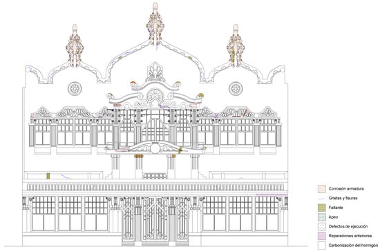 The façades exhibited signs of detachment of decorative elements, which are integral to the façade’s design (Figure 2), and the problem worsened progressively. This building, dating back to 1927, is one of the earliest examples of reinforced concrete construction in Spain [23]. Preliminary analyses suggest that carbonation of the concrete may have compromised the passivity of the steel reinforcement, leading to its subsequent corrosion [24]. The corrosion of the reinforcement results in an increase in volume, as the formation of hydrated oxides at the steel–concrete interface generates internal tensile stresses. These stresses cause the concrete mass embedding the reinforcement to fracture, resulting in the cracking and detachment of the concrete cover [25].