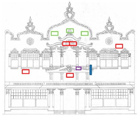 The decorative motifs that adorn the façade, such as cornices, brackets, pediments, and capitals, are crafted from mortar or are micro-concrete-reinforced. These elements exhibit numerous signs of damage, primarily resulting from the corrosion of the reinforcements. The ornamental pieces are reinforced to connect them to the façade or to strengthen individual components. It is also noteworthy that some of these elements were not cast in situ but were prefabricated off-site and subsequently connected to the on-site materials using smooth iron reinforcements.