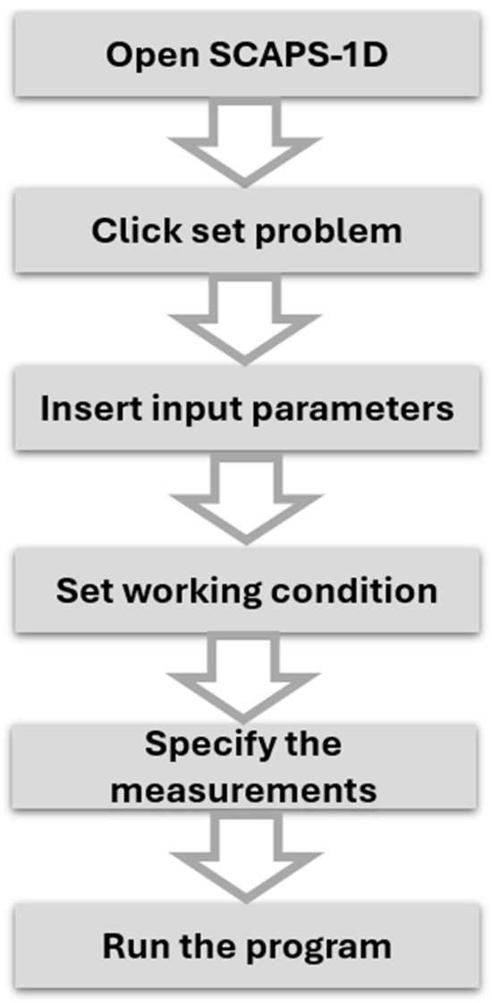 The simulations were carried out under standard conditions, which includes a temperature of 300 K, air mass (AM) of 1.5 G, and irradiation intensity of 1000 W/m2. The flow chart shown in Figure 1 below presents the operation on the SCAPS-1D software (version 3.11). Mainly, SCAPS-1D takes the parameters of each layer, then performs its simulations by using both Poisson’s and the continuity equations presented previously. The light entrance can be defined from the forward direction or backward direction based on the need of the simulated structure.