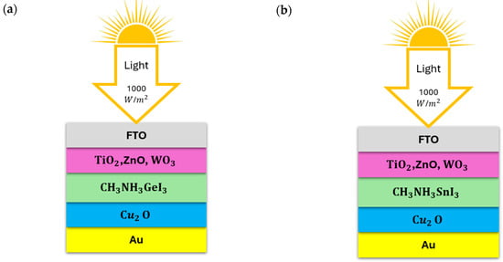 Schematic illustration of the simulated Perovskite solar cells: (a) Germanium-based Perovskite solar cell and (b) Tin-based Perovskite solar cell.