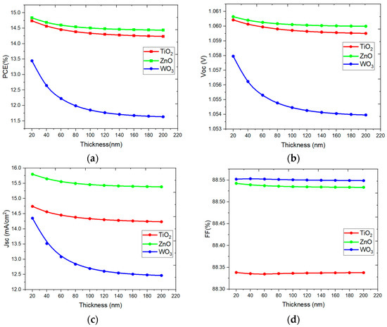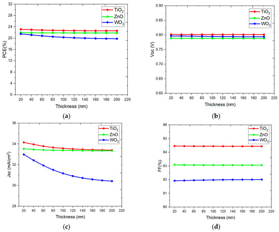 Variations in (a) PCE, (b) Voc, (c) Jsc, and (d) FF as a function of the ETL thickness for the three ETL materials TiO2, ZnO, and WO3 for the Sn-based Perovskite structure.