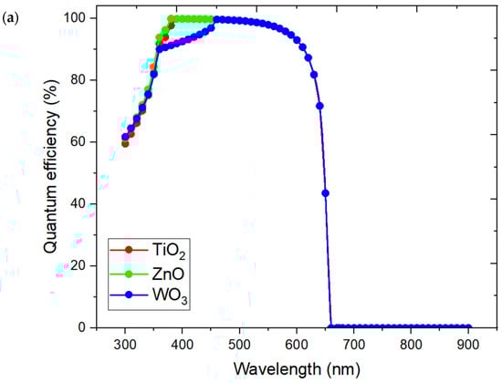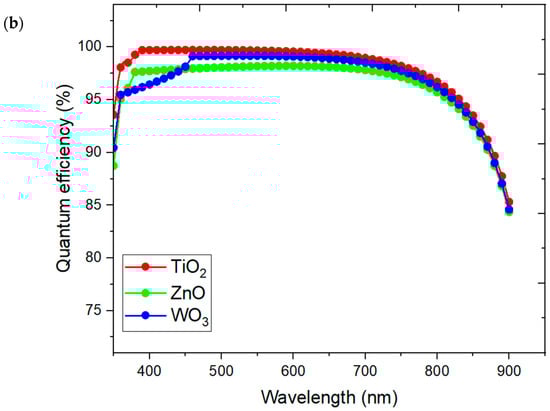 Increasing the different ETLs’ thickness causes electrons to travel a greater distance to reach the top electrode, increasing the likelihood of electrons’ recombination with minority carriers (holes). This, in turn, causes a loss in the Voc. In addition, the structure with a WO3 ETL has a substantial decrease in PCE, Jsc, and Voc when compared to the structures with TiO2 and ZnO, most likely owing to the lower light transmission through the WO3 layer. This decrease in light transmittance is confirmed by Figure 4a,b, which shows the quantum efficiency of the cells with the optimized ETL for each Perovskite structure. From these graphs, it can be concluded that the Tin-based structure performs better than the Germanium-based structure over a wide range spectrum, which will also be shown in a later result. This can be attributed to the small bandgap on Sn (1.3 eV) compared to Ge (1.9 eV), which allows Sn structures to absorb less energy photons and convert them to electrons. It can also be concluded that the Sn-based structures combined with TiO2 ETL enhance the photon transmission and charge extraction. Furthermore, the WO3 structure has the lowest ability for light conversion to electrons, especially at the lower wavelengths. Additionally, the quantum efficiency results agree with the trend seen in the short-circuit results, which show a good balance between the optical and electronic properties.