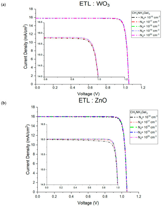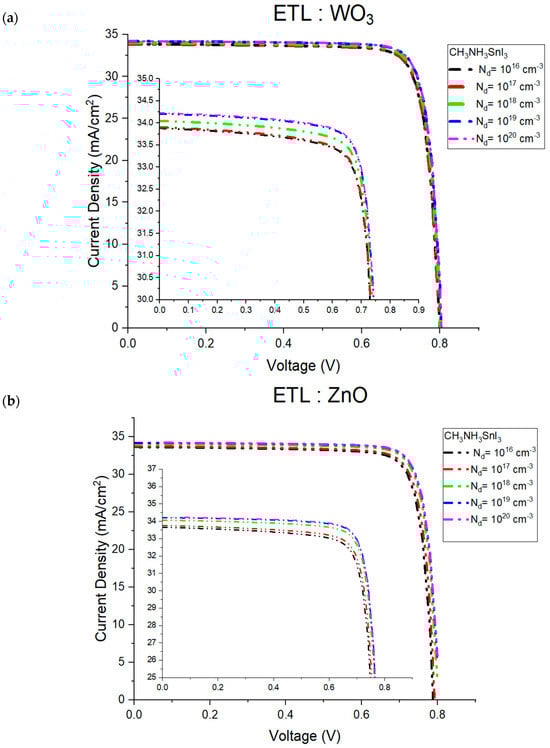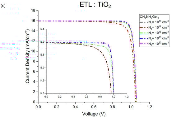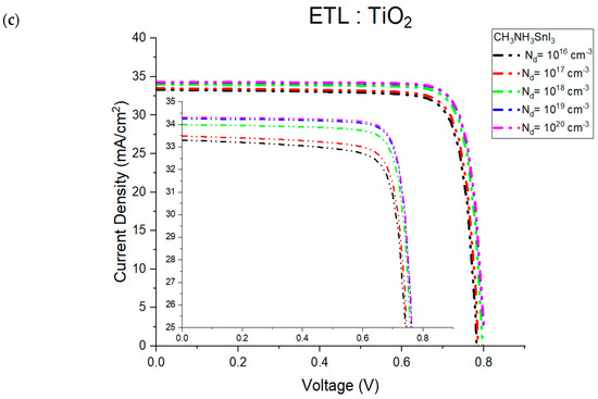 The current density versus open-circuit voltage graphs for Tin-based structures while changing the donor’s doping concentration (Nd): (a) with WO3 as the ETL, (b) with ZnO as the ETL, and (c) with TiO2 as the ETL.