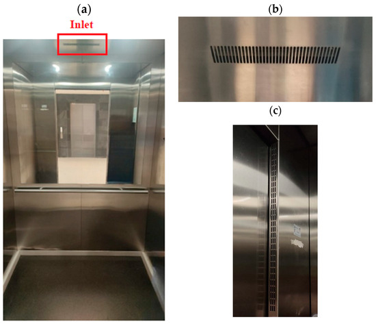 The ventilation configuration currently implemented in the university elevator consists of one fixed grill. The grille’s position within the cabin is detailed in Figure 1a. This grille facilitates the airflow generated by a fan located outside the cabin. The grille consist of 38 equidistant slots along 30 cm, as depicted in Figure 1b. Each slot measures 5 cm in length and 0.5 cm in width. For air exhaust, the cabin is equipped with 4 lines of fixed grilles, located laterally and symmetrically in the door frames, as shown in Figure 1c. These grilles comprise 29 slots, each measuring 1.5 cm in length and 0.5 cm in width, equally spaced along 1.5 m.