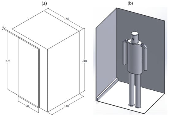 The 3D model of the cabin was completed using the SolidWorks software (v2022). Figure 2a illustrates the computational domain used in all the studied cases, along with its dimensions expressed in centimetres. It is important to note that modelling was limited to the elevator cabin; all ventilation structures were omitted in this phase, as they were related to the boundary conditions to be established. The height defined for the occupants was 1.70 m, and the total surface area was 1.4 m², as depicted in Figure 2b. To simplify the occupant model, the ears, hands, and feet were not considered during the simulations. The occupants were represented by solids based on simple geometric figures. This approach is commonly used in CFD studies to reduce computational costs while capturing the essential effects of occupants on airflow patterns.