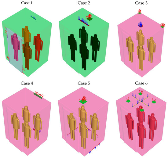 Finally, for Case 6, the intention was to evaluate the effectiveness of the air curtain effect in isolating individuals from assumed suspended contaminants, as also proposed by Li and Feng [28]. In this case, the air inlets and outlets were again located on the ceiling of the cabin. The air outlets were square with sides of 15 cm, and for the inlets, an air curtain in the shape of a cross, 2 cm wide and 1 m long, was used.
