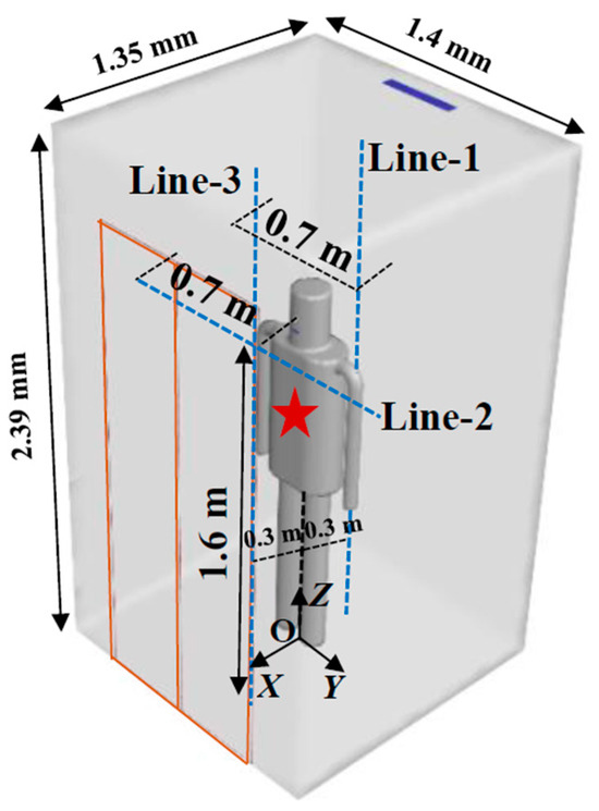 Validation of the model was carried out by comparing the base-case model results against the experimental data reported by Li and Feng [28]. The experimental data were compiled through the measurement of air velocity at seven specific points distributed every 0.3 m vertically along a line located 0.3 m behind the subject (Line-1). The air inlet in the base-case study is depicted as a blue rectangle, as shown in Figure 4. This configuration is similar to our base case, as illustrated in Figure 1 and Figure 2, which also considered only one occupant.