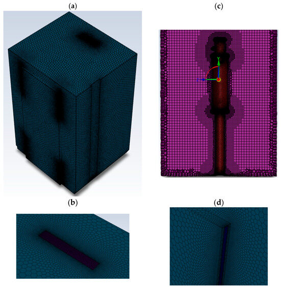 (a) Isometric view of the meshing of the computational domain. (b) Airflow inlet section refinement. (c) Refinement of the occupant boundary wall. (d) Airflow outlet section refinement.