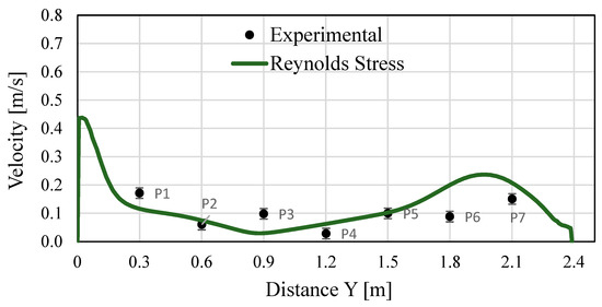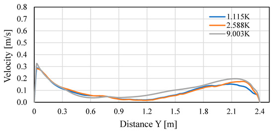 The results obtained in the validation process are presented in Figure 7. They demonstrate that the behaviour of the velocity profiles reported in this study followed a similar trend to that registered by Li and Feng [28]. This indicates that the developed CFD model provides airflow velocity values and trends that are reasonable in comparison to those reported in the referenced article. The authors of the referenced study considered that a difference of 0.06 m/s between simulated values and experimentally measured values was acceptable.
