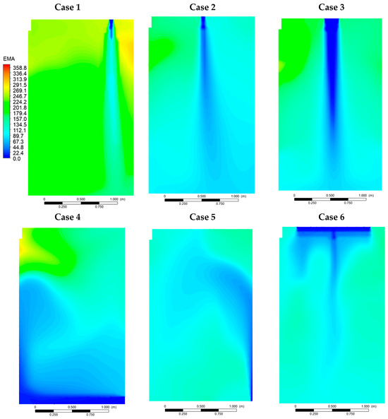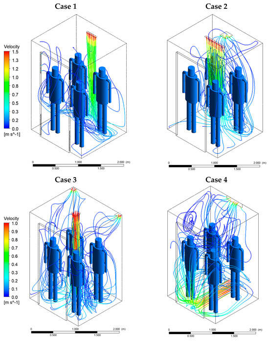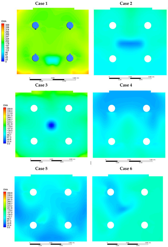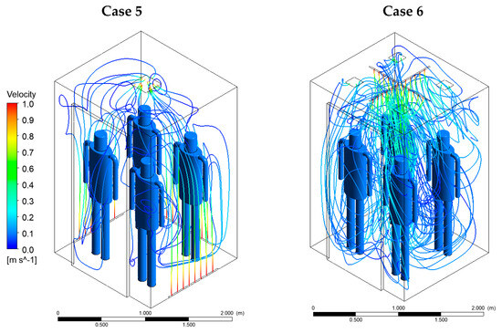 Figure 8 illustrates the trajectories of particles within the defined domain for the six case studies. In Case 1, it was observed that the positioning of the air outlet section did not favour proper circulation throughout the volume of the enclosure. It can be observed that the air exiting from the sides near the doors limits the circulation of air above this zone, which may impact the air change rate. In contrast to the base case (see Figure 3, Case 1), Case 2 considered a wider air inlet in the middle of the upper area and an air extraction grille located on one side of the inlet. In this case, it was observed that the introduced air followed a longer flow path, which may increase the air renewal in the enclosure and reduce the residence time of the air within it.
