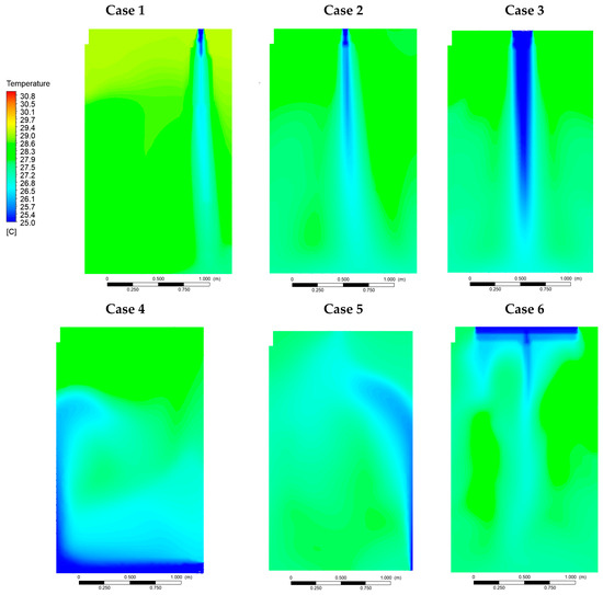 In Case 5, the air inlets at the bottom of the cabin walls caused the entering air to rise and heat up quickly. This led the air to ascend near the wall, while the flow interacting with the occupants in areas close to the centre of the cabin heated up to reach 27.5 °C in most of the volume, with values of 26.5 °C in areas near the air outlet. The temperature distribution was moderately homogeneous in this case. Finally, for Case 6, the temperature showed that the air temperature remained at 25 °C only around the area close to the air inlets. As the air descended through the cabin, it heated up to values around 28 °C. The lowest recorded temperature was located only in the main flow trajectory that originated from the inlet airflow.