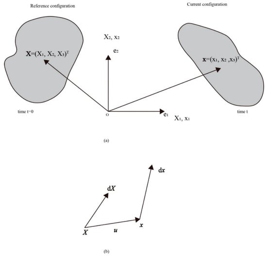 where , , are the displacement components of the elastic large deformation, are the pre-deformation coordinates, and are the post-deformation coordinates. The line element dX before deformation changes to dx after deformation, as illustrated in Figure 1.