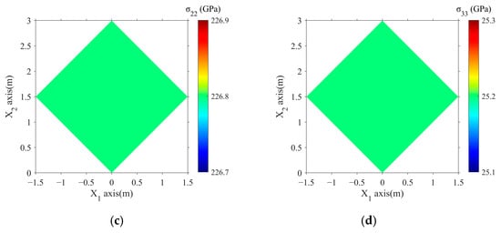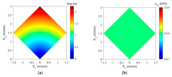 We establish a parallel elastic finite element model (Model A) with a residual accuracy of based on Case 1 (Figure 3). Figure 4 presents contour plots of the total displacement and nonzero stress components from Model A’s intermediate section. The color scale’s upper and lower limits represent the maximum and minimum computational values. The displacement results indicate a 45-degree rotation and stretching of the square plate (Figure 4a). The stress components are all homogeneous (Figure 4b–d).