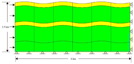 Geometric model illustrating fold deformation over geological time. The model has a length of 6 km and a depth of 2.5 km, featuring two layers of folds above and below. The yellow bands represent crustal folds at varying depths, while the green area denotes the surrounding stratigraphic medium. The left boundary experiences uniform horizontal compression with free sliding in tangent direction, as indicated by a transverse arrow. The upper boundary is unconstrained, while the other boundaries prevent normal displacement and allow tangential sliding, represented by planar rollers.