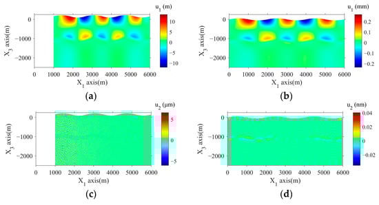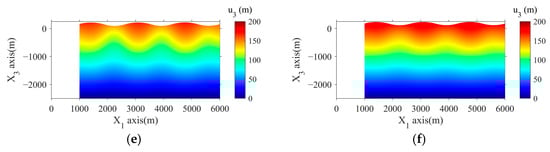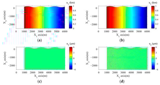 Fold deformation over geological time typically involves significant crustal shortening, leading to large rather than small deformations. We modeled a vertical profile with a thickness of 1 km, spanning 6 km in length and 2.5 km in depth, featuring two layers of folds at the top and bottom (Figure 7). The two yellow bands represent crustal folds at different depths, with a Young’s modulus of and a Poisson’s ratio of 0.25, while the green area represents the surrounding stratigraphic medium with a Young’s modulus of and the same Poisson’s ratio. The right and bottom boundaries have zero normal displacement constraints and allow for free sliding tangentially, while the left boundary applies horizontal compressive displacement, vertical free sliding, and an unconstrained ground surface.