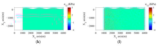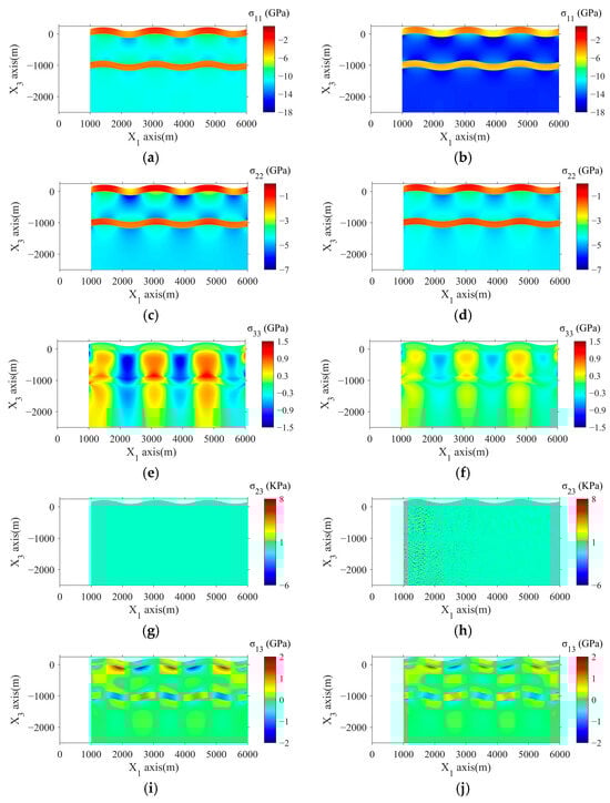 Comparison of stress fields between the elastic large deformation model (Model C) and the elastic small deformation model (Model D). Left column: stress components by Model C (panels (a,c,e,g,i,k)), Right column: stress components by Model D (panels (b,d,f,h,j,l)).