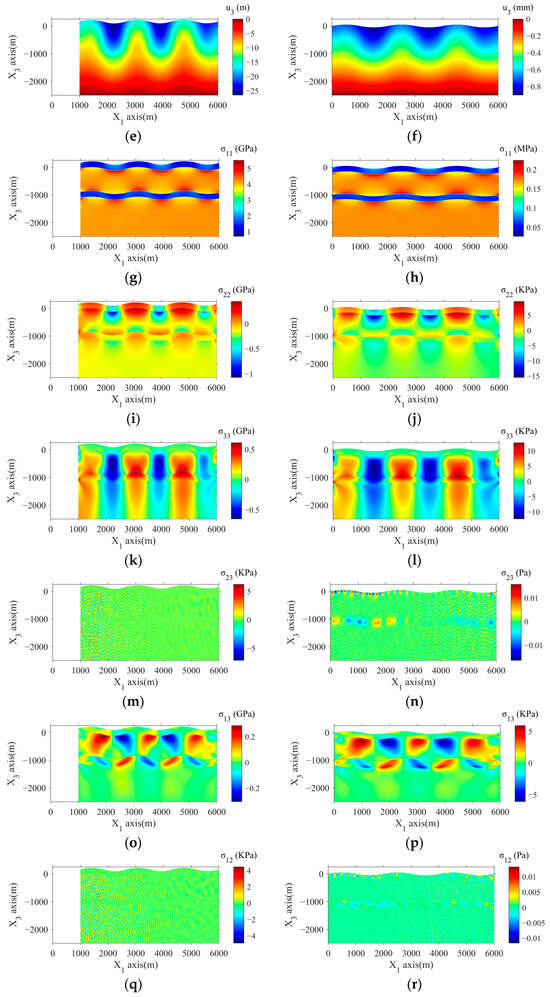 Differences in results between large and small deformation models for compressions of 1000 m (1/6) and 6 m (1/1000). Left column: displacement components u, v, w, and stress components by Models C and D (panels (a,c,e,g,i,k,m,o,q)), Right column: displacement components u, v, w, and stress components by Models E and F (panels (b,d,f,h,j,l,n,p,r)).