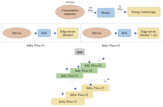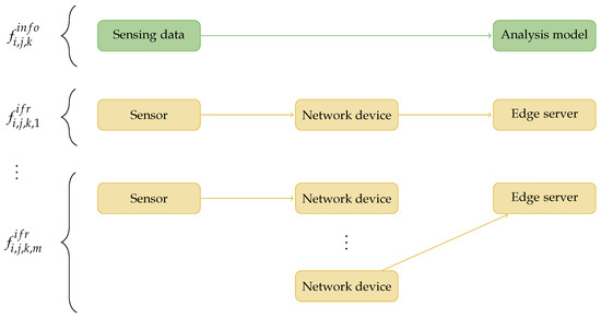 Infrastructure flows are generated from each information flow, as specified in the patterns in Figure 10, and a sensor is established for each source of sensing data and an edge server for each analysis model. In addition, one or more network devices were considered.
