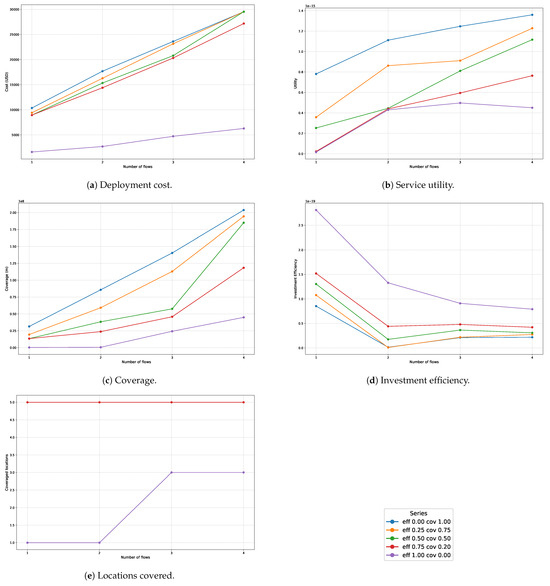 = 0. In this configuration, the covered location metric does not reach a value of 5, whereas all other weight configurations manage to reach or exceed this value. This result indicates that the system’s ability to expand the served geographic area by exclusively prioritizing efficiency over coverage, which is limited even with increased flows. Furthermore, as the number of flows increased in this specific configuration, the number of covered locations increased at a steadier pace than in the other weight configurations. This behavior suggests that, even under the exclusive prioritization of efficiency, the flow increase still contributes to expanding coverage but is less effective. The absence of weight attributed to coverage limits the impact of new flows on the expansion of the served geographic area. In contrast, in configurations where
