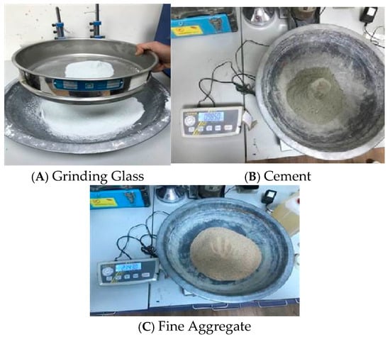 The materials used in this study are illustrated in Figure 1 and consist of cement, fine aggregate (sand) with a maximum aggregate size of 5 mm (according to the information given in Table 1), glass particles from 0.2 to 1.18 mm, a superplasticizer, and water. The research took place with three different concrete mixtures in which foamed expanded glass was used as fine aggregate as a partial or total replacement by volume at replacement levels of 10%, 20%, and 100%. To maintain a constant cement-to-fine aggregate weight ratio, the weight of water was kept constant to maintain a water-to-cement ratio of 0.33 for all mixtures. Because expanded glass is a highly porous material with a higher water absorption capacity than natural sand, it was necessary to use a superplasticizer to compensate for the elevated water demandas in Table 3.
