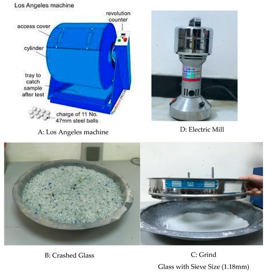 The electric mill and Los Angeles apparatus were used to grind the glasses; the first stage was to crush the local glass bottles into small pieces and then grind them and calculate all the passing weight from the sieve (No. 1.18), as shown in Figure 2. It was observed that when using a replacement of sand with glass, the workability of concrete has become less, so some improved materials must be used to obtain acceptable workability and reduce water and porosity. The improvers give excellent properties to the concrete in its fresh and firm state. One of these plasticizers is the superplasticizer, as shown in Table 2. This material complies with the American Standard ASTM C494 Type A, G [21].