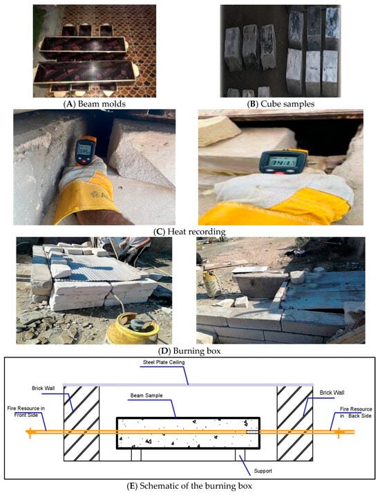 Both cubes and beams were divided into three groups according to the ratio of glass replacement, and each group, which consists of nine cubes and six beams, was tested in three phases: the first phase with no burning, the second phase included burning for one hour, and the third phase included burning for one hour and a half in a local furnace, as simulated in Figure 3D. The burning happened in a brick box covered by a steel plate, and the temperature was recorded and rose gradually until it reached the peak value (550 °C) and was then tested.