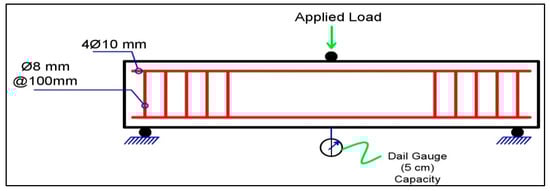 For each mix shown in Table 3, it cast nine cubes (50 × 50 mm) and six beams (1000 × 200 × 200 mm), according to ACI code 318-19 [22] with four bars as reinforcement (Ф 10 mm @ 150 mm). Tensile tests were conducted on several specimens (at least three) prepared from the steel reinforcement bars that were used in the tested beams. Static yield stress and the ultimate strength of the tested bars are summarized in Table 2 by ASTM A615/A615M-13 [23].