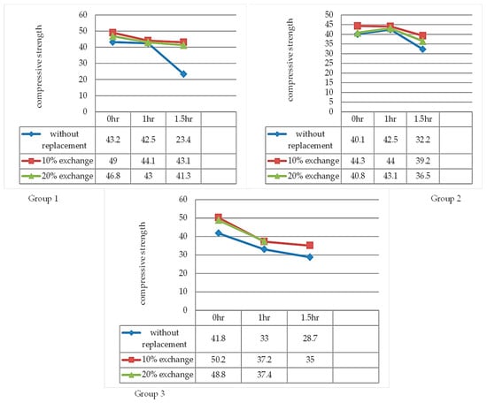In addition, when comparing the two groups, G2 and G3, with the first group, G1, as a reference group, the characteristics of compressive strength, ultimate load capacity, and first crack load were considered, as shown in Table 4. It was observed that by replacing 10% and 20% of sand with glass with no burning, the physical properties of hard concrete, such as compressive strength, were improved, increasing by about 16% and 9%, respectively, and increasing about by 3–2% when the time of burning was one hour and one and a half hours, respectively.