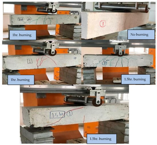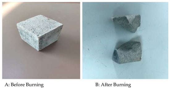 It was found for samples without burning that the compressive strength increased by about 10–29% by a replacement ratio of 10% of sand by glasses and by 1–16% by increasing the ratio when the replacement ratio of sand was 20%. That is because the particles of glass fill the gaps of concrete, but they had a negative effect when the ratio of replacement was more than 20%. It was observed that if the burning time was one hour, the compressive strength would decrease by approximately 1% to 26%. However, if the burning time was increased from one hour to an hour and a half, the compressive strength would decrease by approximately 20% to 51%. From the shape of the failure of cubes as in Figure 6, which was one of the cubes in group 3, when the time of burning was one hour and a half, the cube failure will be an explosion under fire effect.