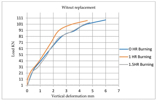For the 20% replacement of glasses, group 3, the deflection at the yield load and the ultimate load were approximately equal to 0.5 mm and 6 mm for burning for one hour and a half, respectively. This indicates that by increasing the ratio of replacement glasses to 20%, the structural beam element became more brittle, as shown in Figure 13. The ultimate load strength increased by about 6 when the burning was one hour and 12 when the burning was one hour and a half compared with the beams without burning. That means the ratio of sand replacement by glass was 10%, which was the best.