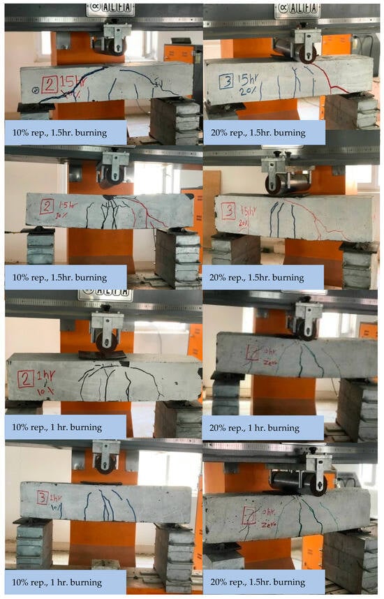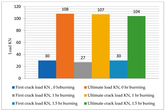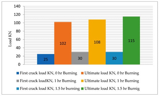 The flexural characteristics of beams shown in Table 4 show that the ultimate load capacity after burning decreased by about 5–20% for beams, but by replacing sand with glass, the ultimate load and the first crack load improved, and there was approximately the same load of beams without the replacement of sand with glass, especially when the ratio was 20%.
