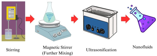 16]. Ultrasonication was applied for one hour at 40 kHz using a sonicator from PCI Analytics Pvt. Ltd. (Mumbai, India) to ensure uniform dispersion. Ultrasonic bath sonication was used for nanoparticle dispersion; however, literature studies indicate that probe sonication provides superior energy transfer and more effective dispersion. The relatively high sedimentation observed in this study suggests that bath sonication alone may not be sufficient for long-term nanofluid stability. A surfactant, cetyltrimethylammonium bromide (CTAB), was obtained from Loba Chemie Pvt. Ltd. (Mumbai, India) and used at 0.1% volume to prevent agglomeration in MWCNT-based nanofluids. The stability of the nanofluids was verified through sedimentation analysis over 24 h. The specific procedures for preparing the nanofluids are shown in