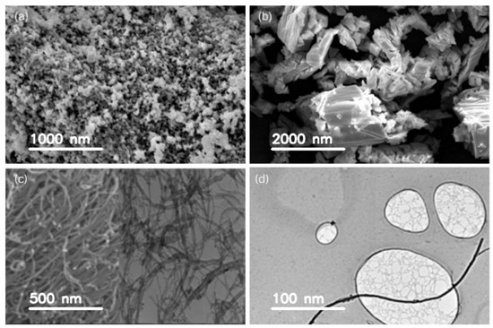 Figure 2c, the morphology of multi-walled carbon nanotubes (MWCNTs) is illustrated, displaying entangled and fibrous structures forming agglomerates.