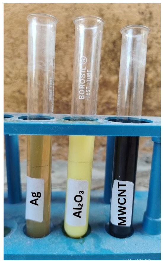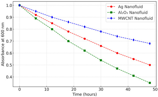 11]. Absorption spectroscopy using a UV–visible spectrophotometer (Shimadzu UV-2600, Kyoto, Japan) was conducted to assess the stability of nanofluid dispersions. Absorbance measurements were performed at a wavelength of 600 nm at regular intervals over 48 h. A decrease in absorbance over time indicated nanoparticle sedimentation, with MWCNT-based nanofluids exhibiting the least reduction, followed by Ag and Al