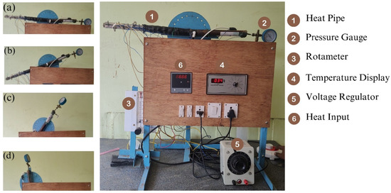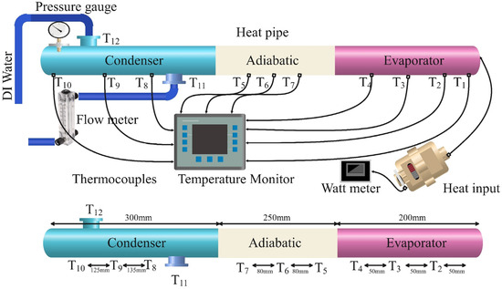 Thermocouples with an accuracy of ±0.5 °C were attached along the heat pipe to monitor the temperature distribution. A total of six thermocouples were installed—two on the evaporator, two on the condenser, and two on the adiabatic section. The temperature readings were recorded every second using a data acquisition system connected to a computer. The TR of the heat pipe was calculated by Equation (1) [